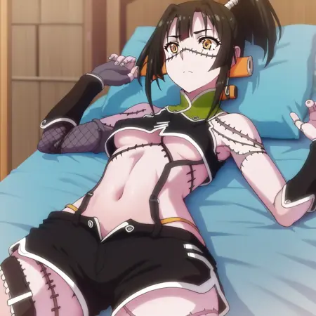 モンスター娘のいる日常の苦無をインスパイアしたゾンビ少女を作成するために使用。プロンプトワード:1girl、solo、zombie girl、kunai、パッチワーク肌、縫い目、鋭い歯、ゾンビ歯、ゾンビ、ポニーテール、オープンハルタートップ、胸元ハルタートップ、スプリットスカート、前腕巻き、すべてkunaiの外観をベースに。