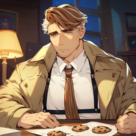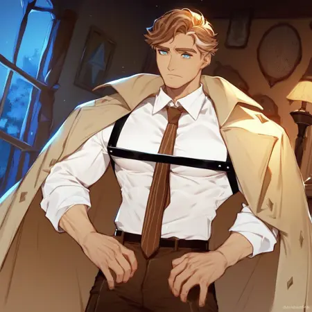 collared shirt , white shirt, collared shirt, coat, coat on the shoulders, chest harness,brown necktie, brown trousers,