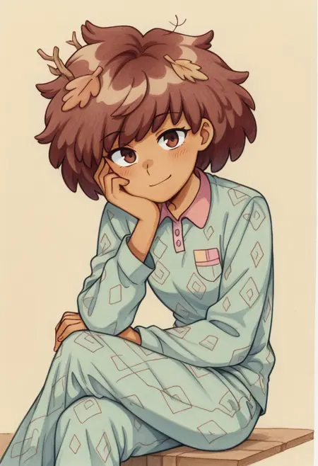 애니 부ENCHUY: CHAnneBoon, 머리에 잎사귀, [STCrest Shirt, / AnBronze Chest Piece, 분홍 플리츠 치마, 한쪽 양말, 한쪽 노란 신발,] [AnRes Outfit,] [AnThaiDress,] [AnFP Shirt, 노란 자켓을 허리에 매달아,] [AnMuse Outfit,]