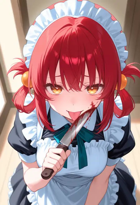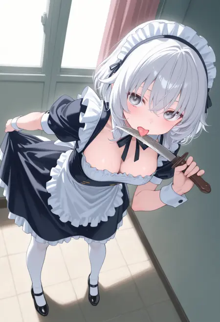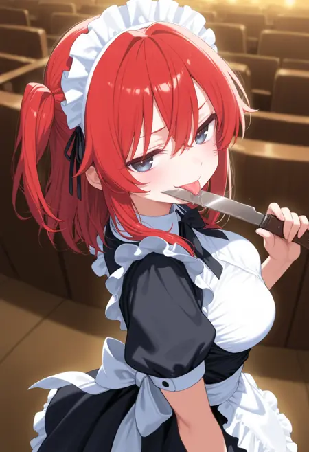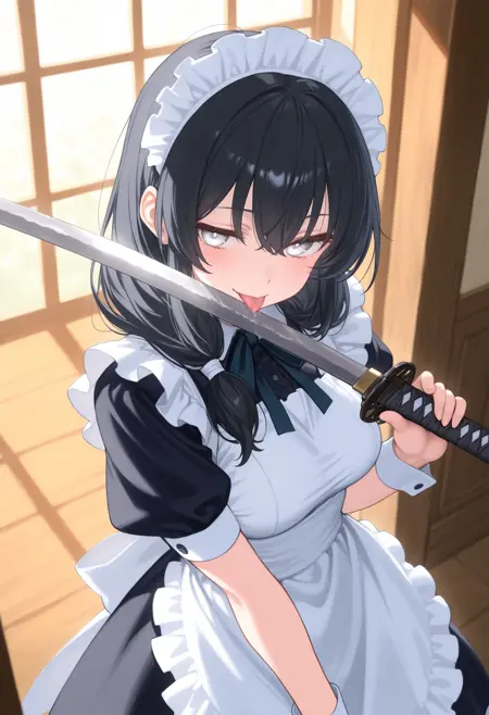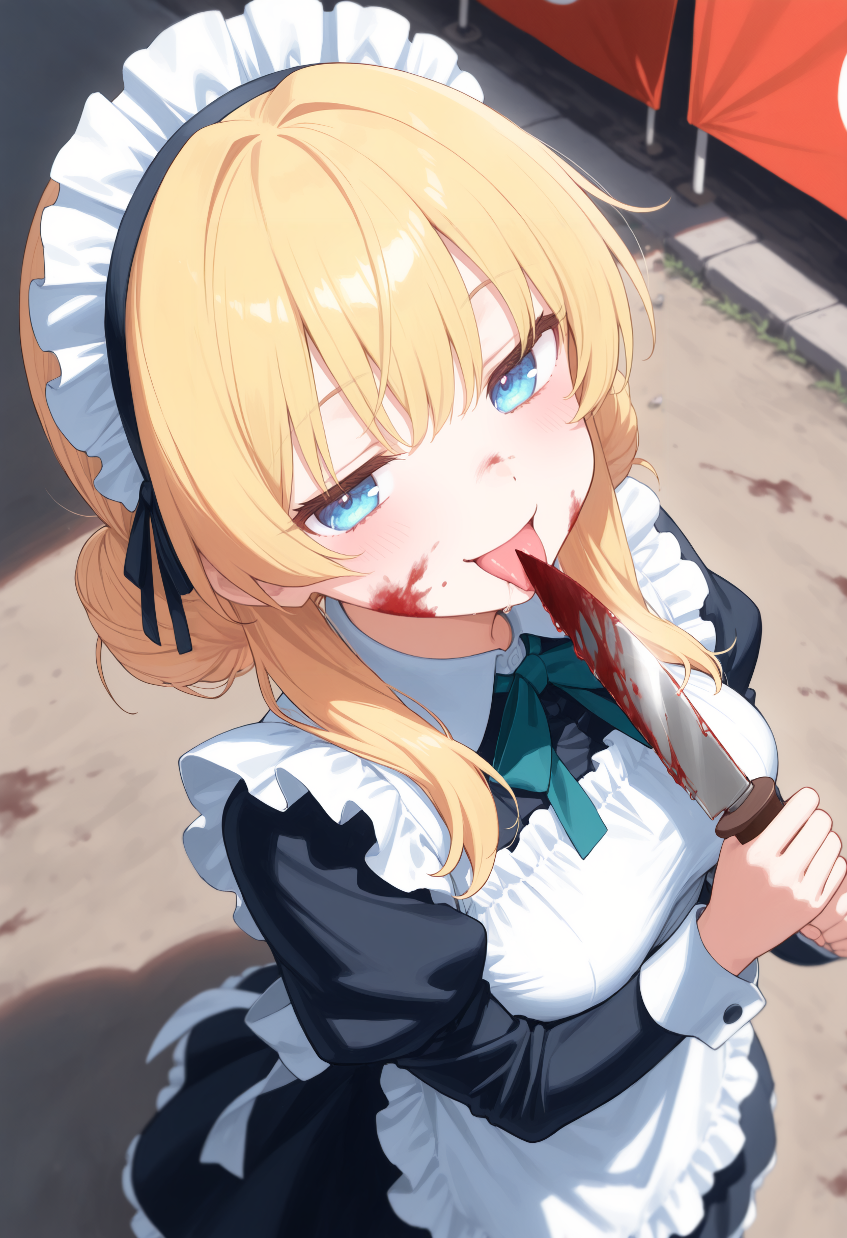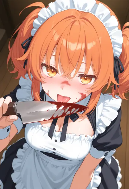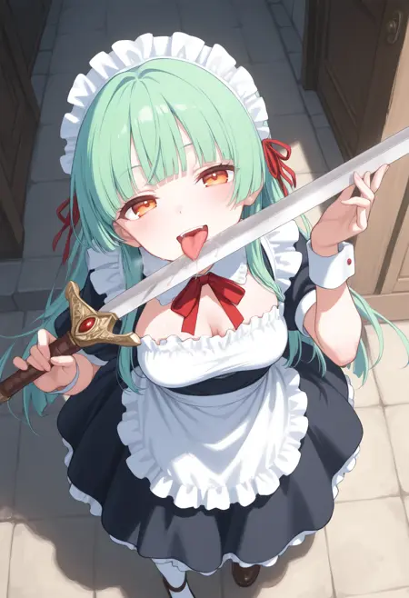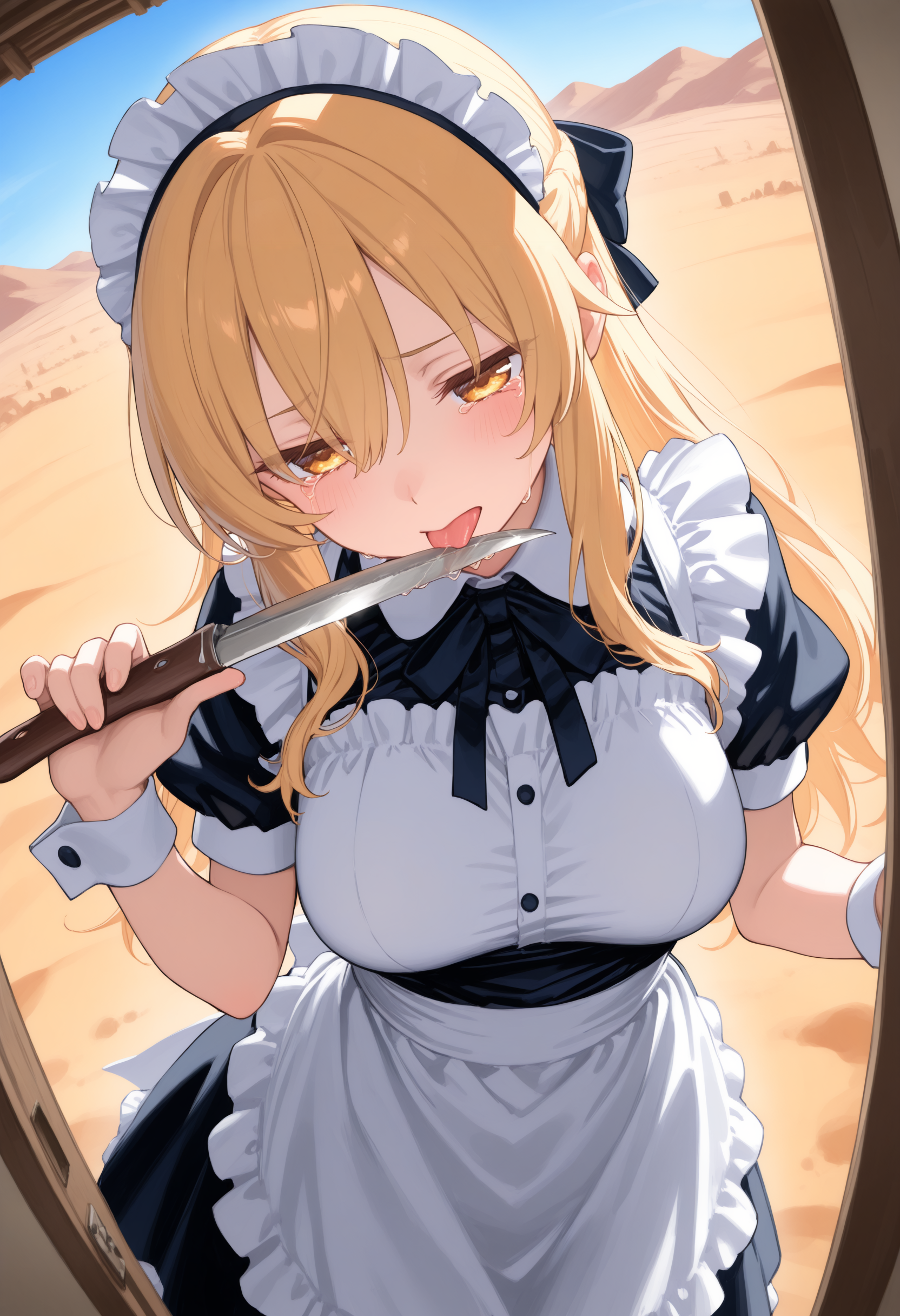 이 LoRA는 원래 학습된 개념이지만, 혀만 내밀고 제대로 핥지 않는 문제를 보완합니다. 트리거만으로도 작동하지만, "tongue out"과 핥고 싶은 칼날의 프롬프트를 함께 입력하세요. 학습의 중심이 칼이므로, 칼날이 짧아지는 문제는 "huge weapon"을 추가하면 개선될 것 같습니다. 혈액이나 타액을 더 선호한다면 "blood,saliva"를 추가하세요.