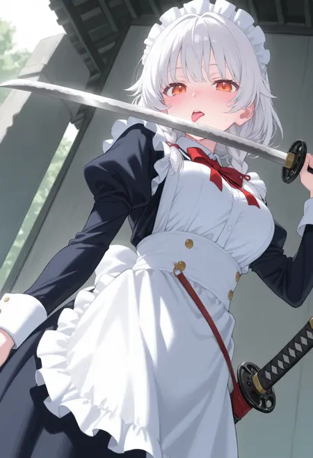 もともと学習された概念ですが、舌を出すだけではなかなか舐めないのを補正します。トリガーだけでも出力されますが、「tongue out」と舐めさせたい刃物のプロンプトを一緒に使ってください。学習の中心はナイフなので、刃が短くなる場合は「huge weapon」を追加すると改善されるかもしれません。血や唾液がある方が好みの場合は、「blood,saliva」を追加してください。