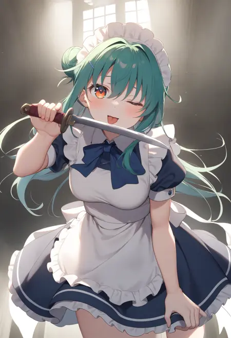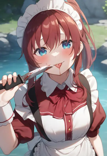 元々学習している概念ですが舌を出すだけで中々舐めてくれないのを矯正します。トリガーだけでも出ますが tongue out と舐めさせたい刃物のプロンプトを入れてください。ナイフが学習の中心なので刃が短くなるのは huge weapon を入れればマシになる気がします。血や唾液があった方が好みの場合は blood,saliva を追加して下さい。