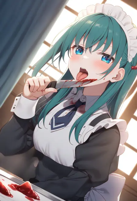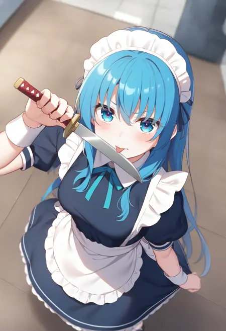 Illustrious版のトリガーワードは licking blade 、Animagine版は licking knife です。