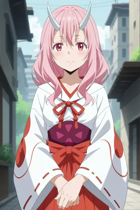 트리거: 1girl, solo, shuna, 긴 머리, 분홍 머리, 오니 뿔, 오니, 일본 복장, 하카마, 기모노, 미코, 눈 사이의 머리카락