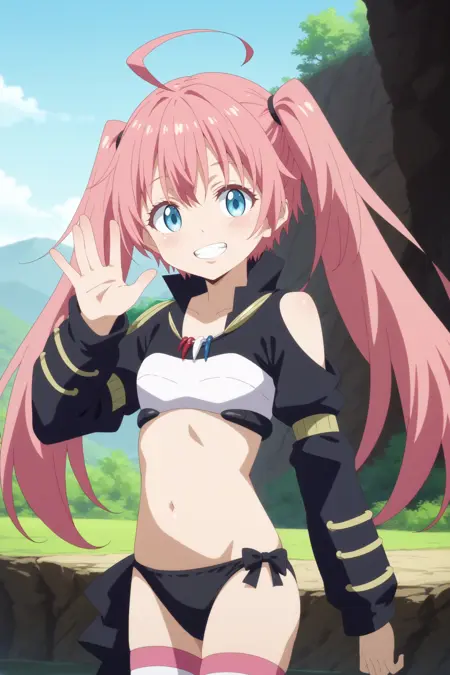 触发词:1girl,solo,milim nava,long hair,twintails,smile,underwear,panties,tighhighs,stripped,ahoge,long sleeves,sky,jewelry,clenched teeth