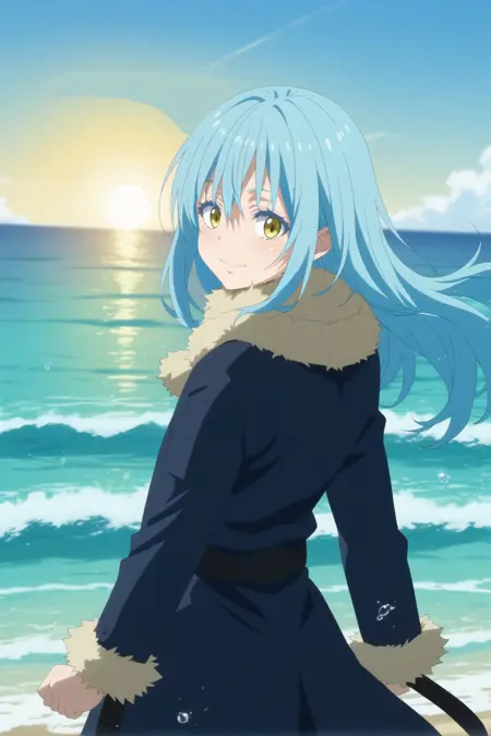 触发词:1girl,solo,rimuru,long hair,smile,androgynous,bangs,hair between eyes,fur collar,scarf,fur trim,coat,blue coat