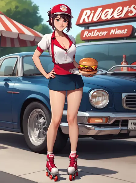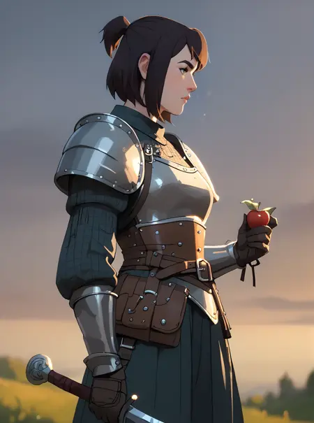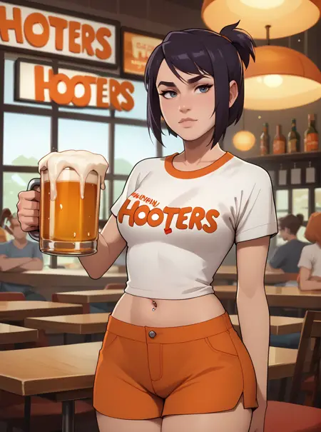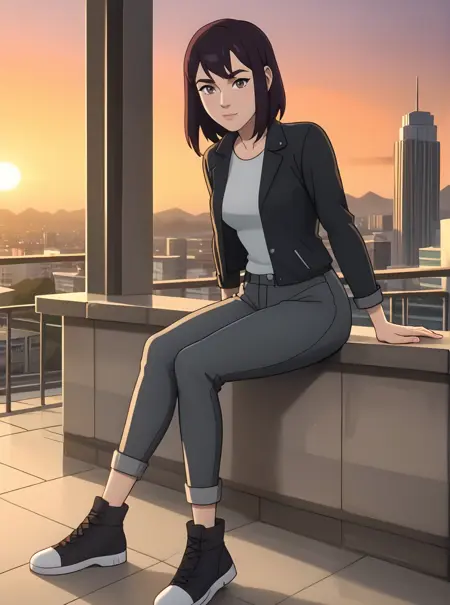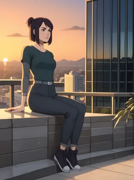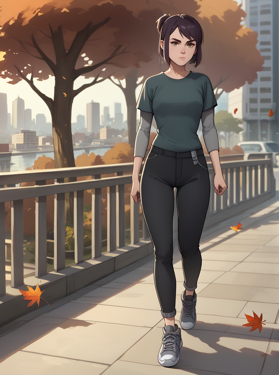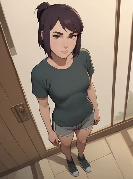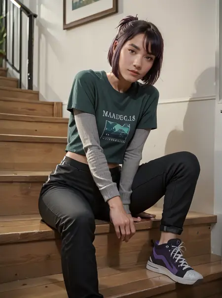 彼女の服装は通常、緑のトップス、グレーのアンダーシャツ、黒のズボン、スニーカー、短いポニーテールです。紫の髪を追加することもできますが、プロンプトに含めなくても通常は反映されます。マディは混血であるため、リアルな描写には「Asian」または「half-Asian」を追加すると良いです。