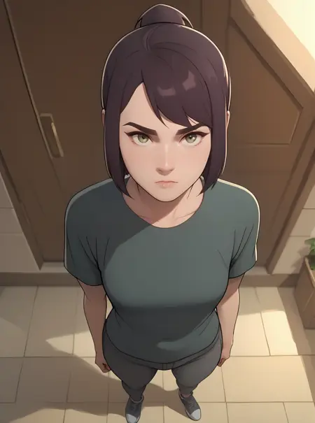 그녀의 옷은 보통 녹색 상의, 회색 안투시르트, 검은 바지, 스니커즈, 짧은 말머리입니다. 보라색 머리카락을 추가할 수도 있지만, 프롬프트에 없어도 보통 자연스럽게 나타납니다. 매디가 혼혈이기 때문에, 캐릭터를 사실적으로 묘사하려면 아시아계 또는 혼혈 아시아계라고 추가하는 것이 좋습니다.