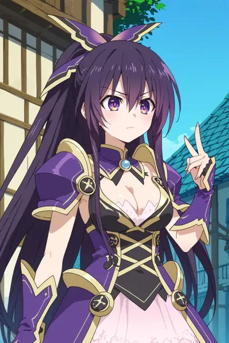触发词:1girl,solo,tohka yatogami,long hair,armor,ponytail,breasts,cleavage,medium breasts,very long hair,hair between eyes,shoulder armor