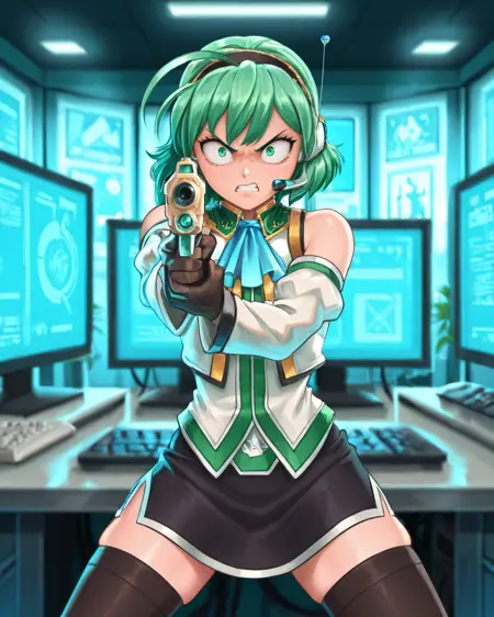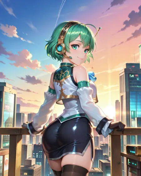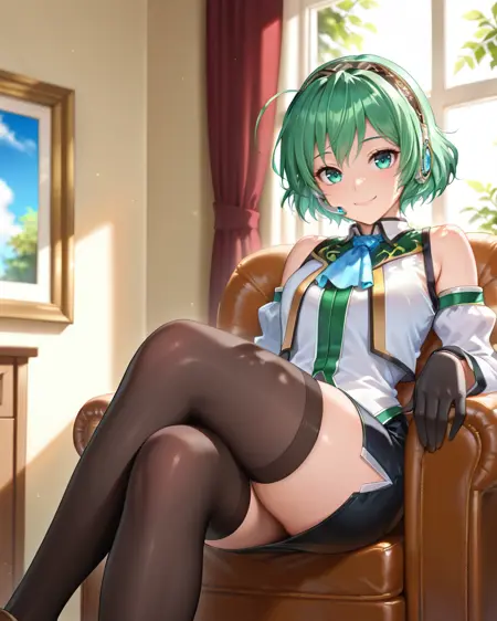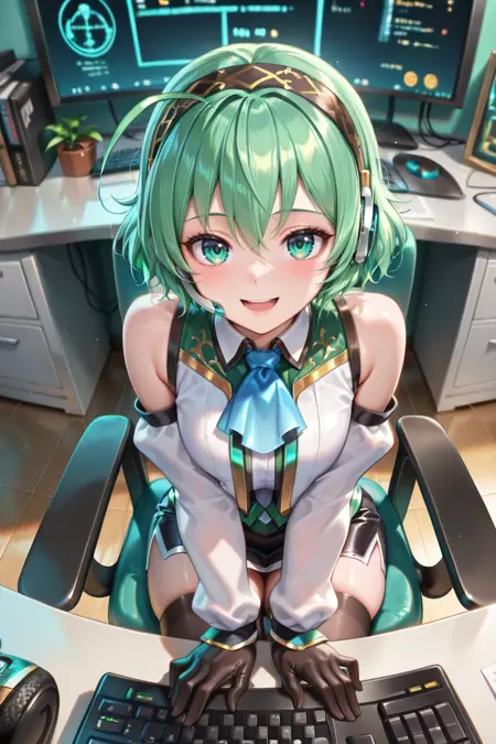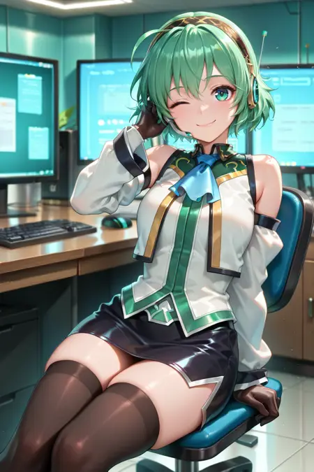 Helpful Tags: 1girl, green hair, short hair, green eyes, hairband, headset, antennae, radio antenna, blue ascot, ascot, bare shoulders, vest, white vest, white shirt, shirt, sleeveless shirt, green trim, gloves, black gloves, skirt, black skirt, pencil skirt, detached sleeves, white sleeves, thighhighs, black thighhighs, boots, high heel boots, high heels,