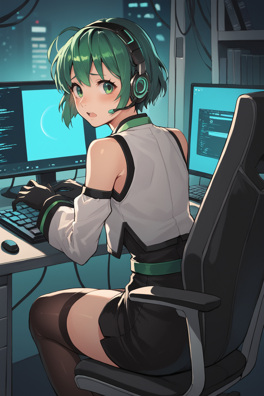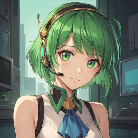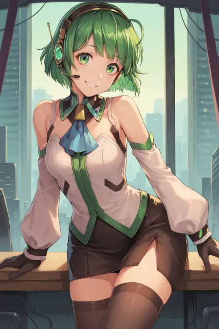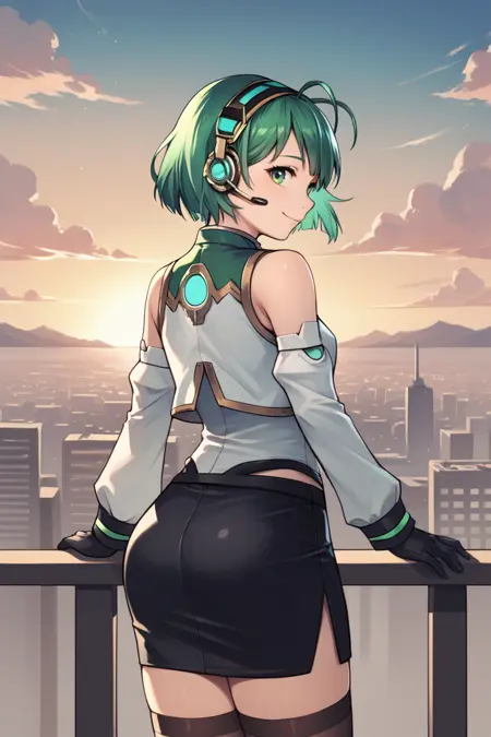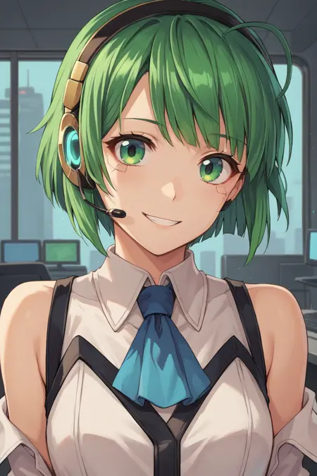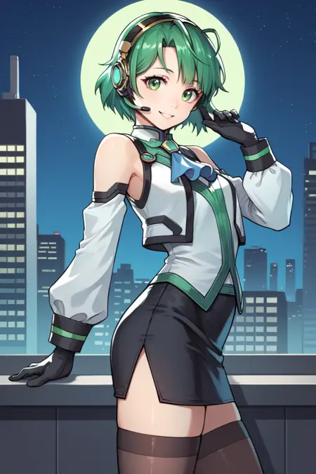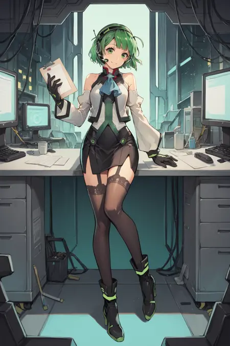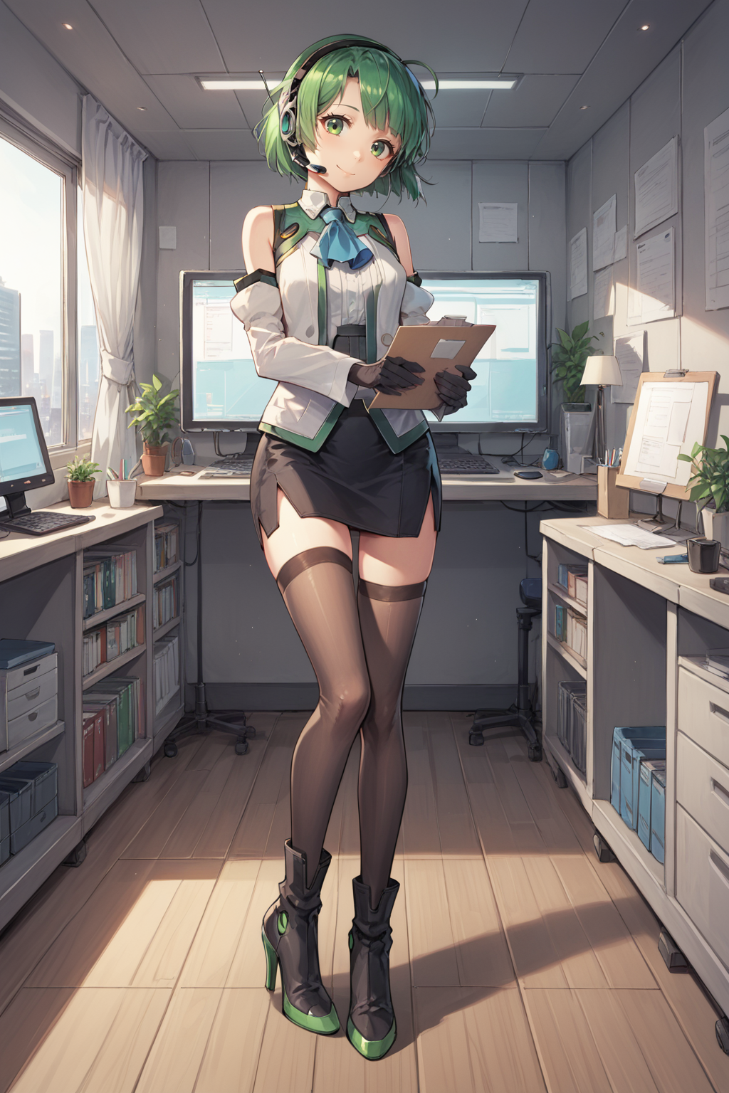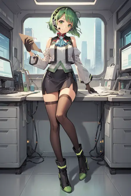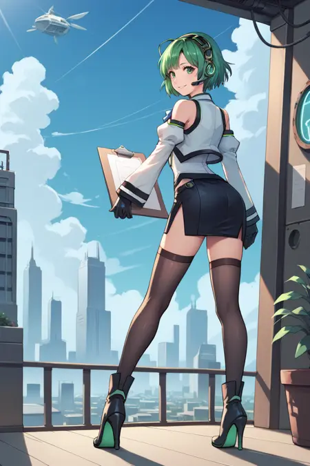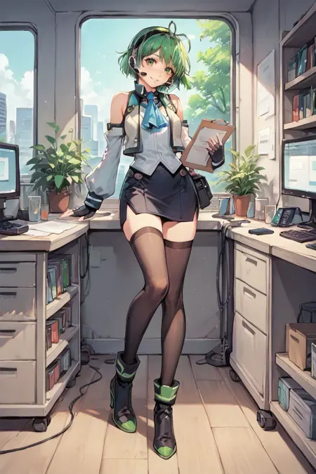 Helpful Tags: 1girl, green hair, short hair, green eyes, hairband, headset, antennae, radio antenna, blue ascot, ascot, bare shoulders, vest, white vest, white shirt, shirt, sleeveless shirt, green trim, gloves, black gloves, skirt, black skirt, pencil skirt, detached sleeves, white sleeves, thighhighs, black thighhighs, boots, high heel boots, high heels,
