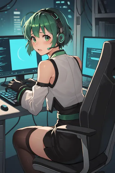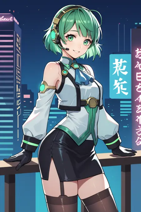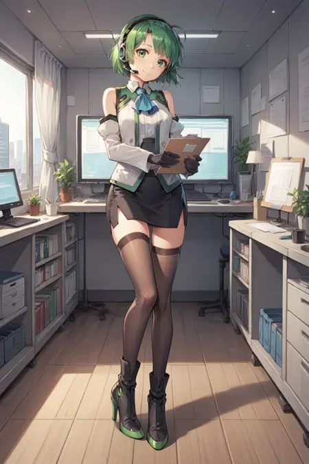 常用标签: 1girl, 绿发, 短发, 绿眼, 发带, 耳机, 天线, 收音机天线, 蓝色围巾, 围巾, 裸露肩膀, 背心, 白色背心, 白色衬衫, 衬衫, 无袖衬衫, 绿色镶边, 手套, 黑色手套, 裙子, 黑色裙子, 铅笔裙, 分离袖子, 白色袖子, 过膝袜, 黑色过膝袜, 靴子, 高跟靴, 高跟鞋,