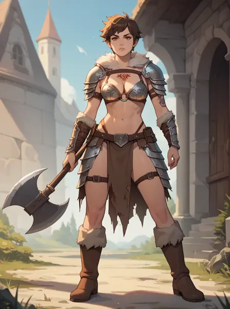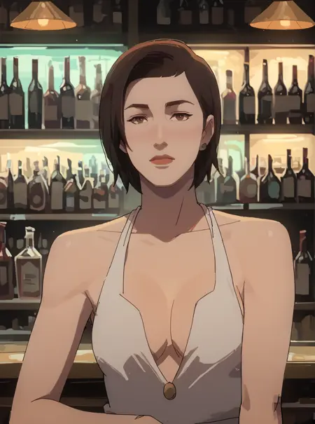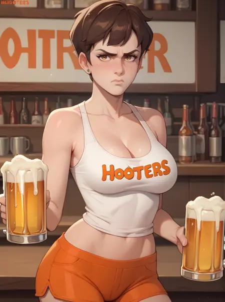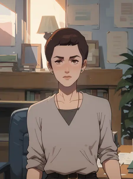 她通常穿着棕色上衣、黑色长裤,留着短发。还有一种来自闪回场景的版本,可通过添加关键词“sidecut”来生成,头发会稍长一些。我注意到,Pony似乎不太喜欢绘制头发非常短的女性角色,因此根据所使用的检查点不同,有时头发会比原版略长一些。