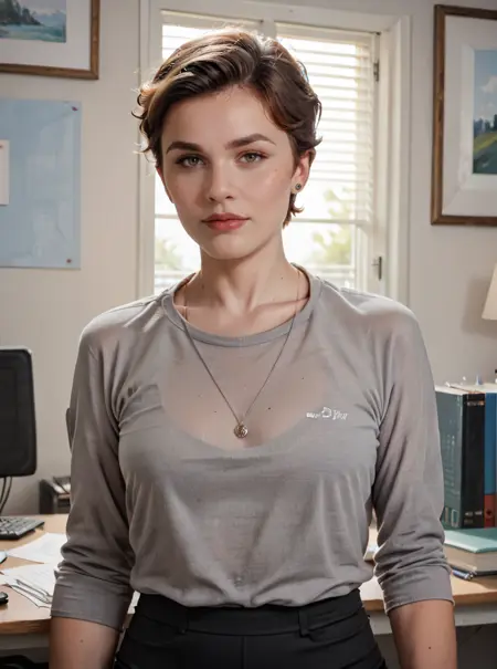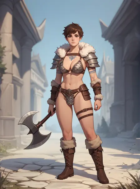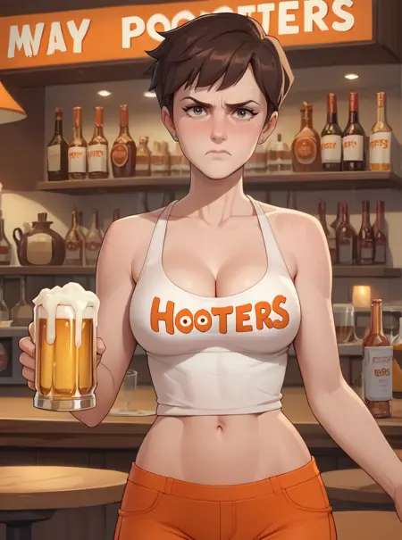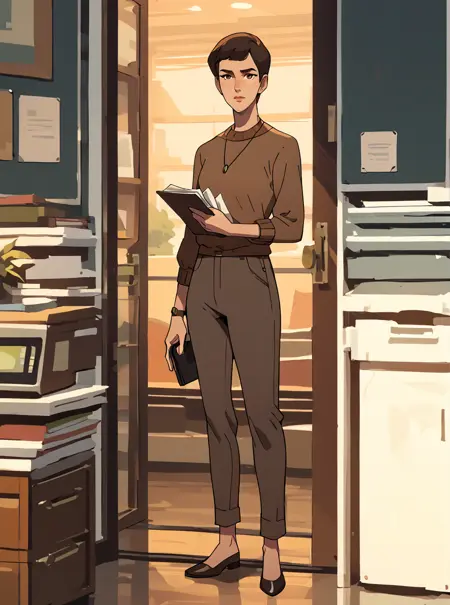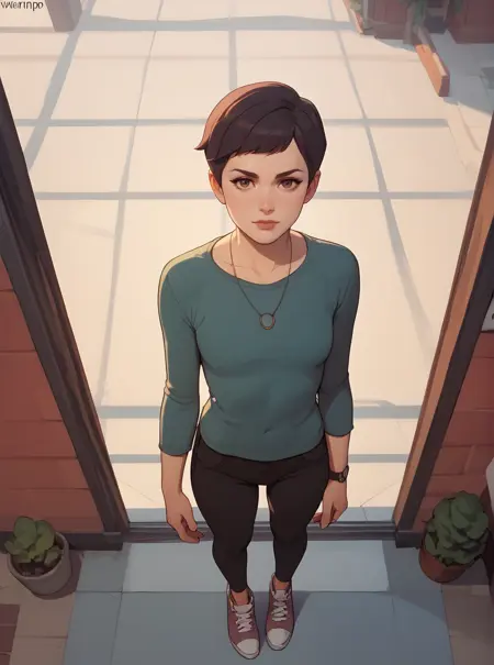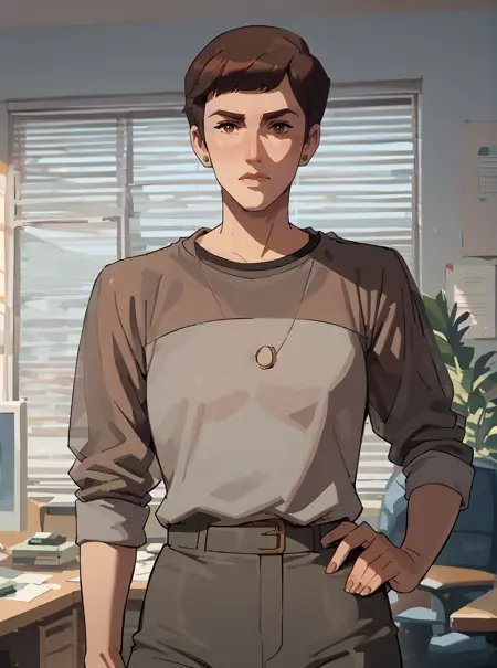 Her outfit is usually brown top, black pants, short hair. There is also a version of her from flashbacks that you can prompt with the word "sidecut", for slightly longer hair. One of the things I noticed is pony seems to have an aversion to drawing women with very short hair, so sometimes the hair will come through slightly longer than usual depending on the checkpoint used.