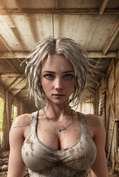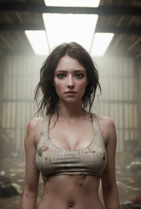 超高精細な写真: ((混乱した倉庫の中にいる女性、セクシーで着古した破れたタンクトップを着ている)), ((細部までリアルな顔と目)), キネマティックな照明、8K解像度、(モデル撮影スタイル), サンセット、(下から見た絵の構図:1.4), 自然な胸