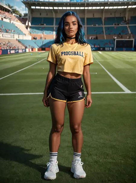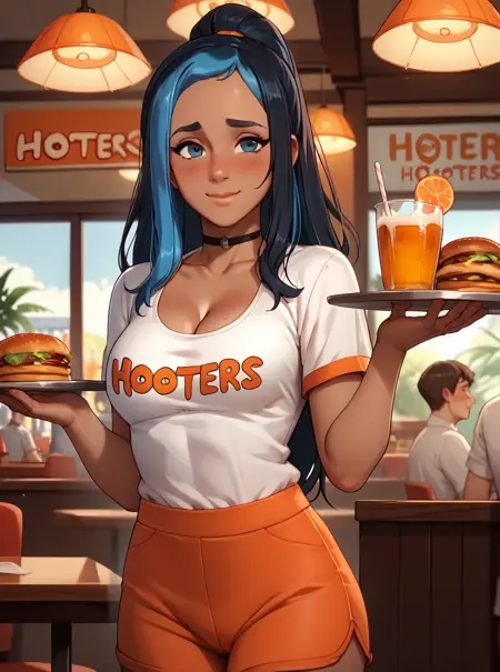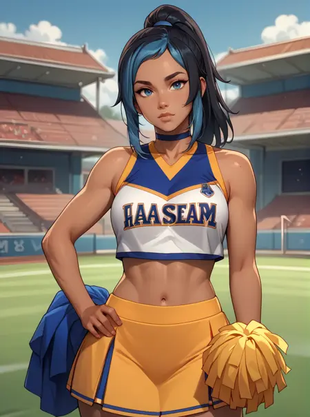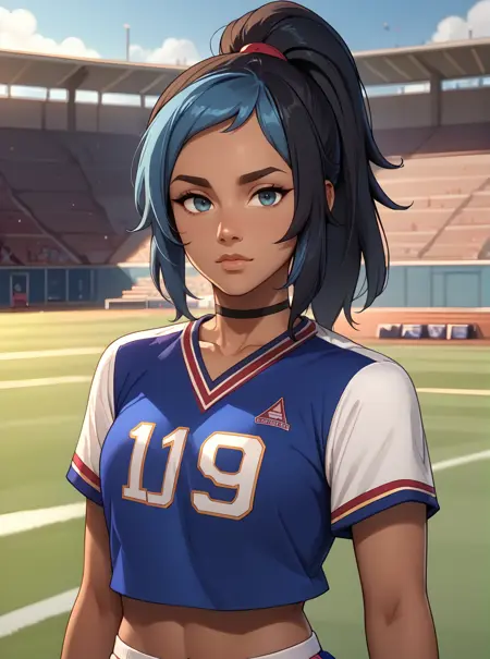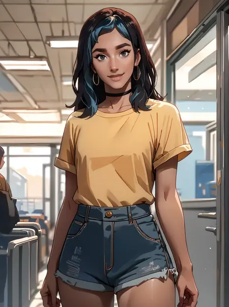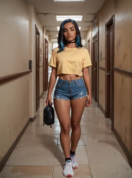 그녀의 복장은 보통 어두운 피부, 노란 셔츠, 청바지 반바지, 검은 머리, 파란 머리, 초커입니다. 이중색 머리만 추가해도 일부 체크포인트에서는 두 개의 분리된 머리색 대신 효과가 있습니다. 하지만 일부 체크포인트에서는 우연히 세 번째 머리색이 추가되기도 하는데, 왜 그런지는 잘 모르겠습니다.