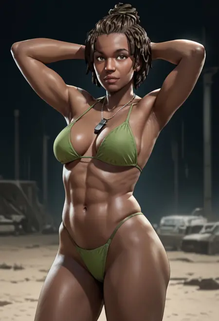 green shirt, sleeveless, black pants, body armor, arm armor, leg armor, vambraces, fingerless gloves, dog tags, shoes,