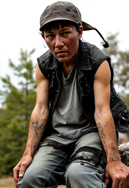 Be descriptive about the real life blemished skin, acne, ripped and dirty clothes, wet and muddy hair, etc., in your prompt.