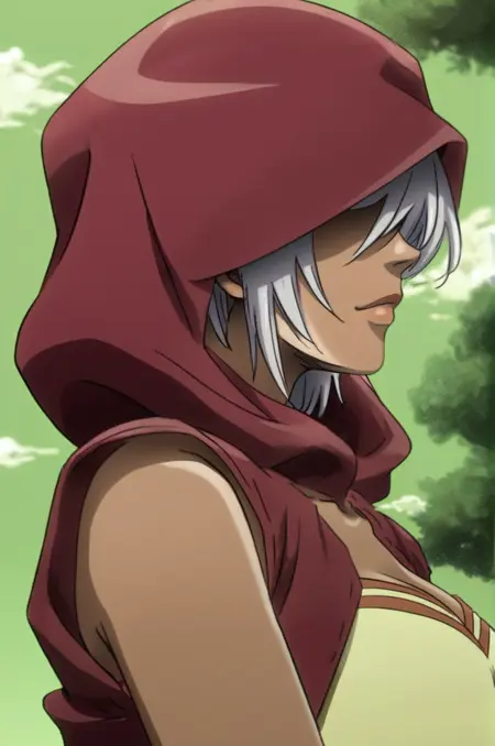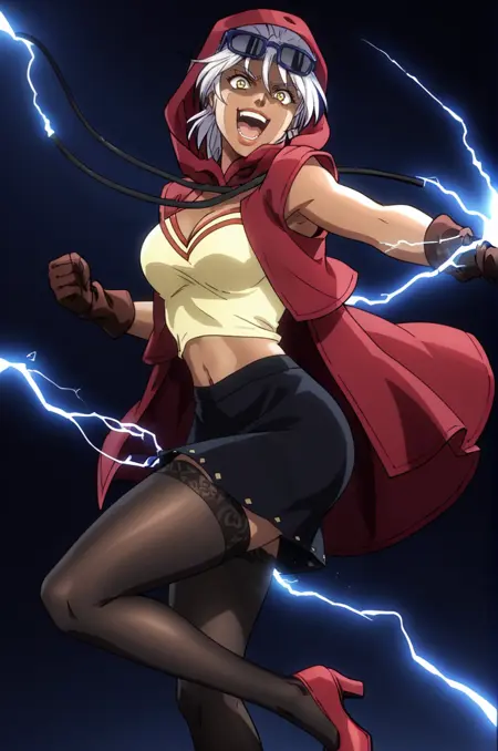 Prompt something like: 'mariah, girl, white hair, hair covers eyes, tanned skin, sunglasses on head, neutralexpression, red cloak, short sleeves, brown gloves, yellow top, black skirt, dark stockings, red heels' For the full works :)