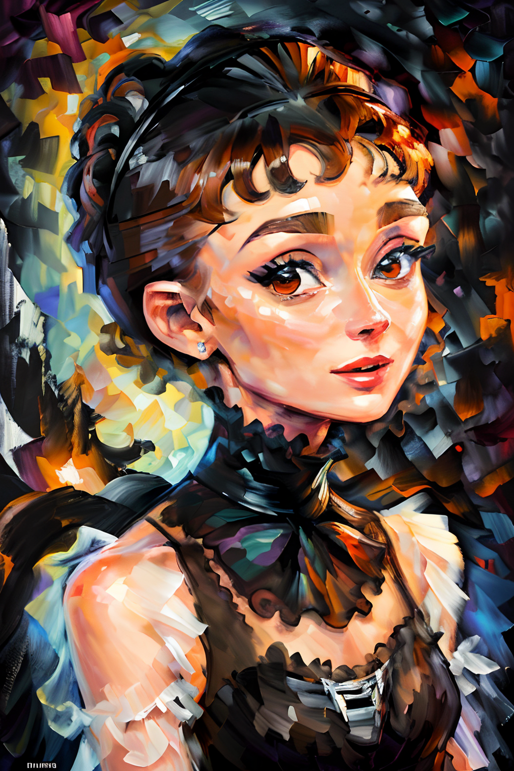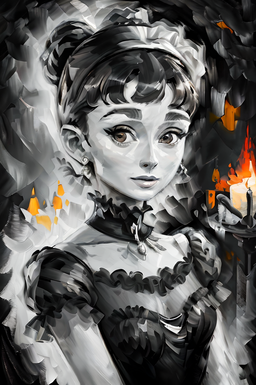 오드리 헵번의 초상화, 흑백 유화, 로맨티시즘, 캔버스 아트 인쇄물, 밝은 깊이감 있는 유화 색채, 인상파 유화 lora:afrem0v-000013-768x768x15:0.75, afrem0vDabbs:1.1, afremov 음성 프롬프트: 서명