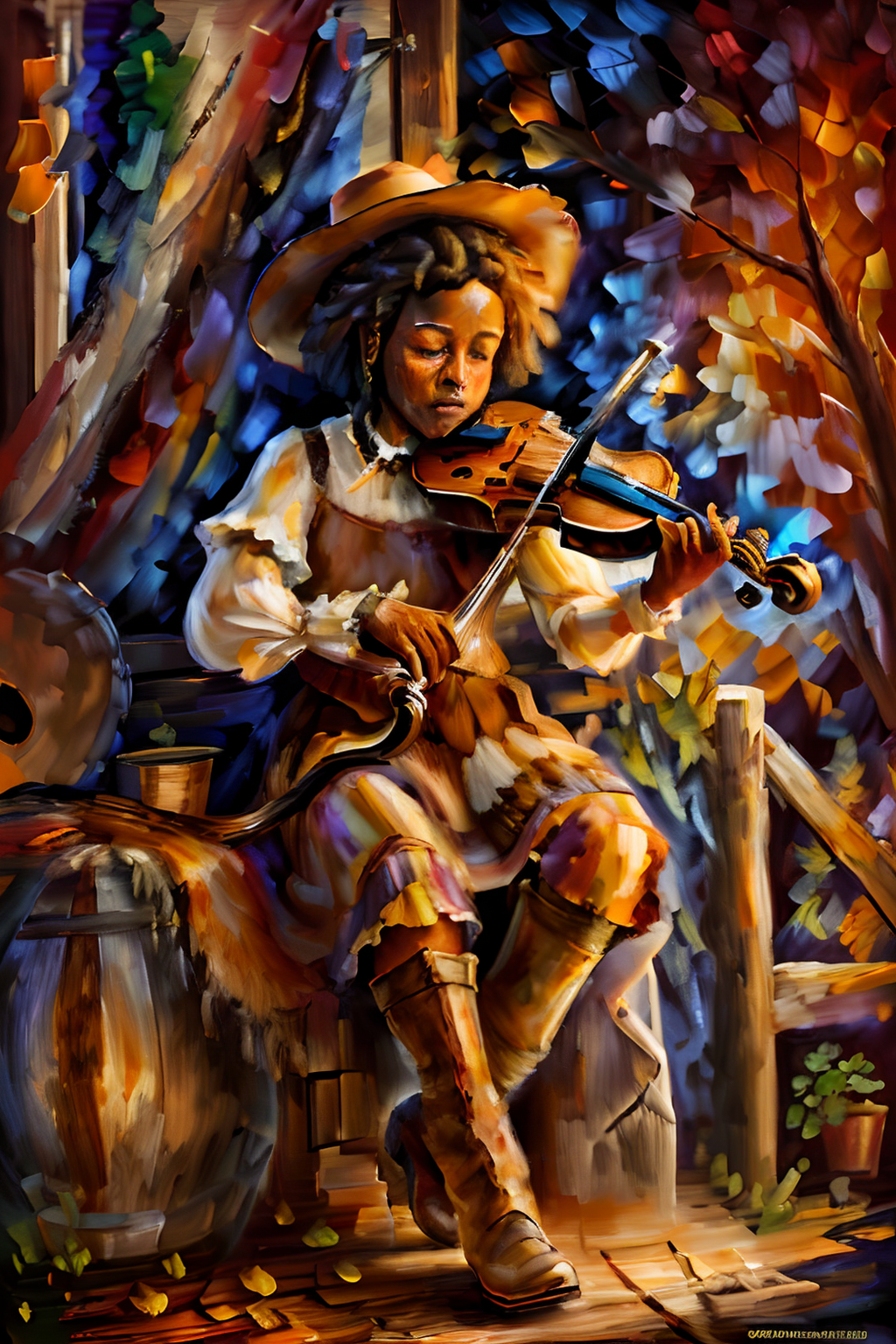 아프리카계 미국인 바이올리니스트, 카운트리 음악, 농장, 디테일한 레마르크트 얼굴, 밤, 밝은 깊이감 있는 유화 색채, 고해상도 유화, 인상파 유화 lora:afrem0v-000013-768x768x15:0.75, afrem0vStrokes:1.1, afremov