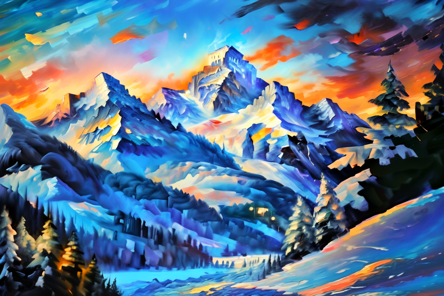 겨울의 프랑스 알프스 풍경, 흰 눈 덮인 산맥, 스키, 밝은 깊이감 있는 유화 색채, 고해상도 유화, 인상파 유화 lora:afrem0v-000013-768x768x15:0.75, afrem0vStrokes:1.1, afremov