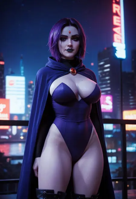 트리거는 (레이븐), (빨간 이마 보석:1.3), 곧고 짧은 머리, 보라색 머리, 세밀한 머리, 보라색 눈, 표현력 풍부함, 고트 메이크업, 회색 피부 톤, 질감 있는 피부, 복근의 암시입니다.