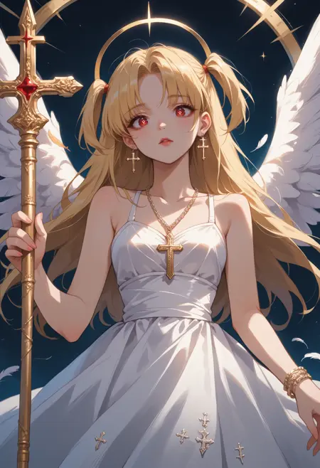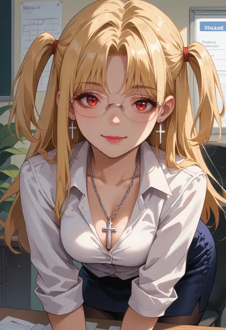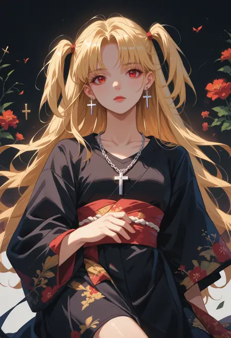 トリガー: wrnchdnamanemisa, blonde hair, long hair, two side up, bangs, red eyes, jewelry, necklace, cross necklace, earrings