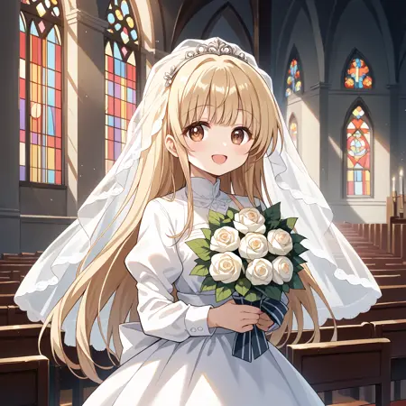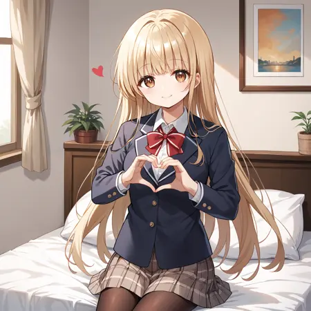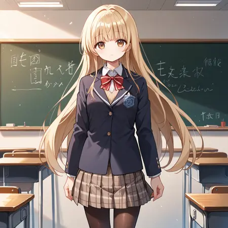 School Uniform : shiina mahiru, brown eyes, long hair, blonde hair, school uniform, black jacket, blazer, long sleeves, red bow, white shirt, collared shirt, grey skirt, plaid skirt, brown pantyhose,