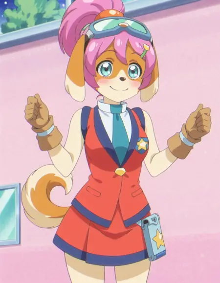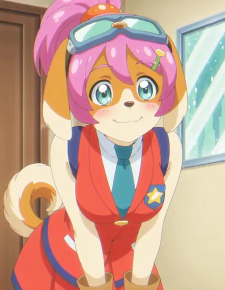 score_9, score_8_up, score_7_up, 1girl, solo, anime screencap, furry female, goggles on head, dog ears, goggles, gloves, blue necktie, red jacket sleeveless, blue eyes, dog girl, animal nose, brown gloves, red skirt, hairclip, body fur, pink hair, short hair, lora:MaryAnn:0.8