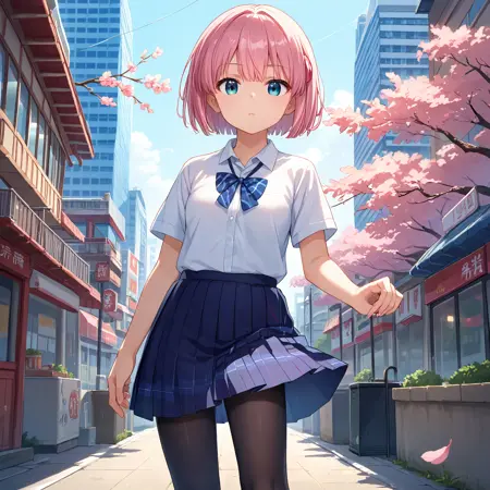 校服:千代田桃子,蓝色眼睛,粉色头发,短发,桃子校服,发饰,发夹,校服,白色水手领,黄色连帽衫,连帽外套,开襟外套,水手服,颈带,蓝色裙子,百褶裙,白色过膝袜,