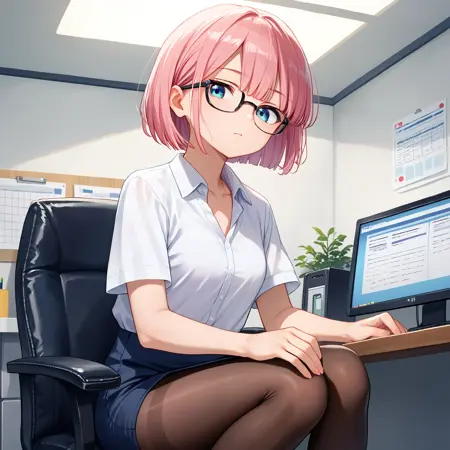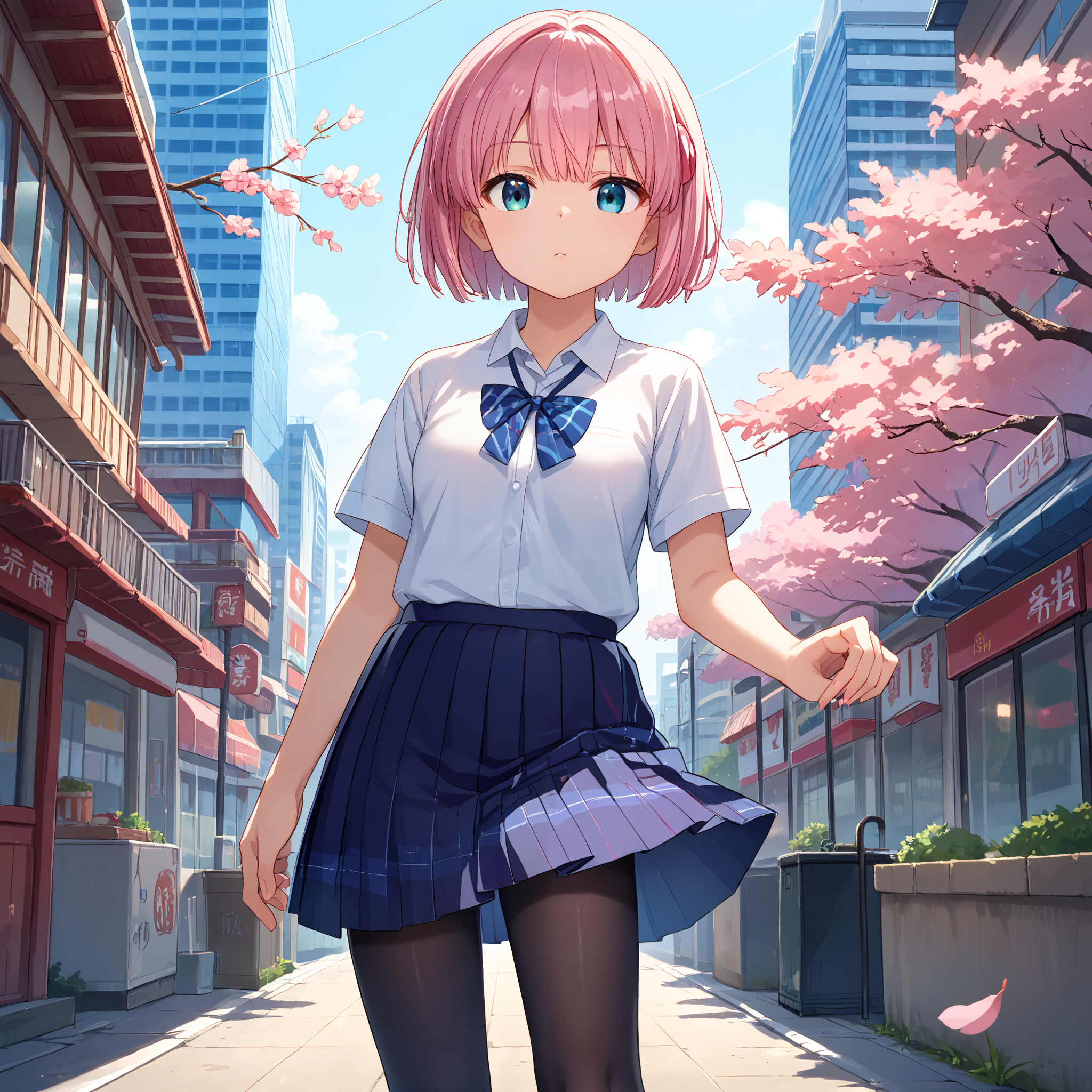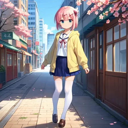 School Uniform : chiyoda momo, blue eyes, pink hair, short hair, momo school, hair ornament, hairclip, school uniform, white sailor collar, yellow hoodie, hooded jacket, open jacket, serafuku, neck ribbon, blue skirt, pleated skirt, white thighhighs,