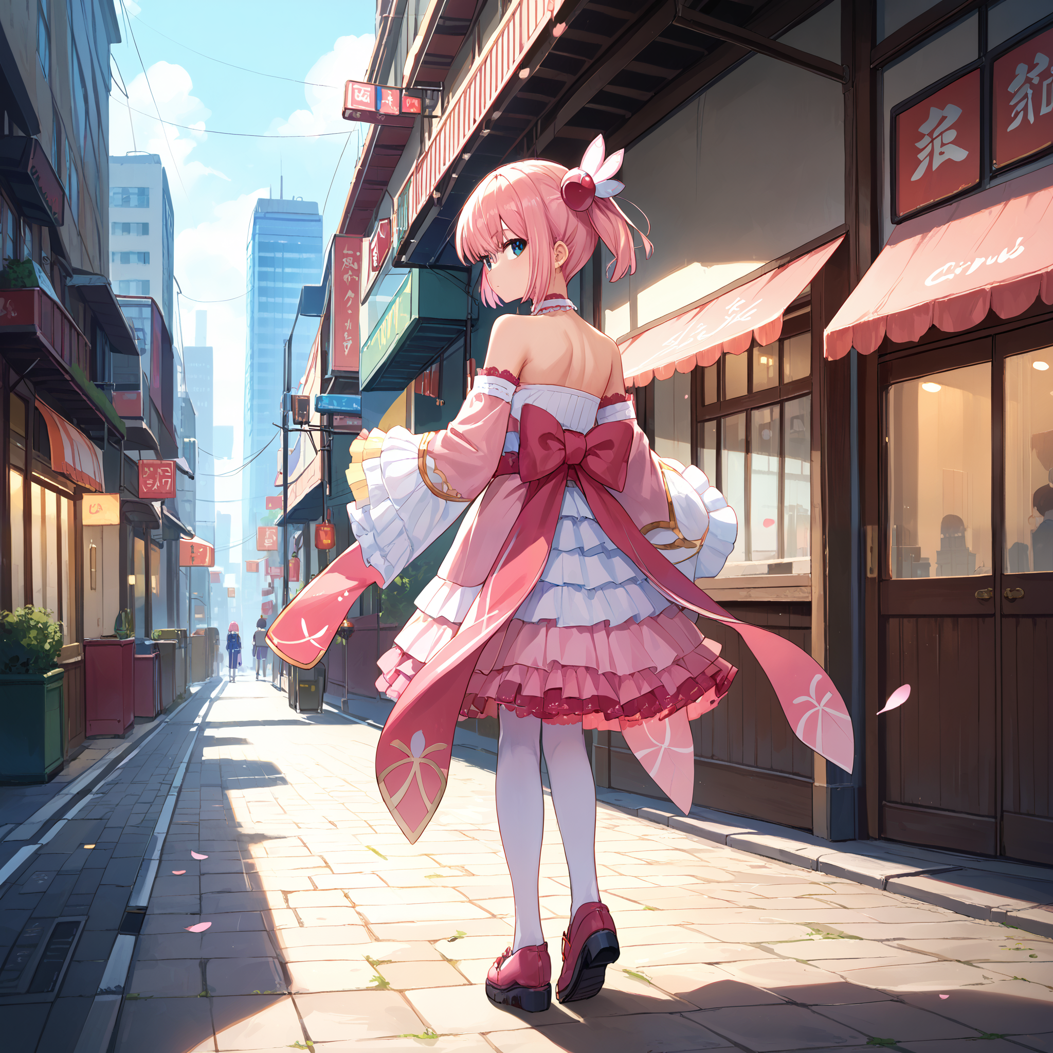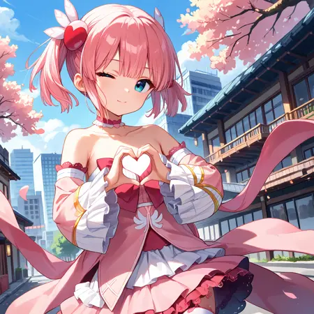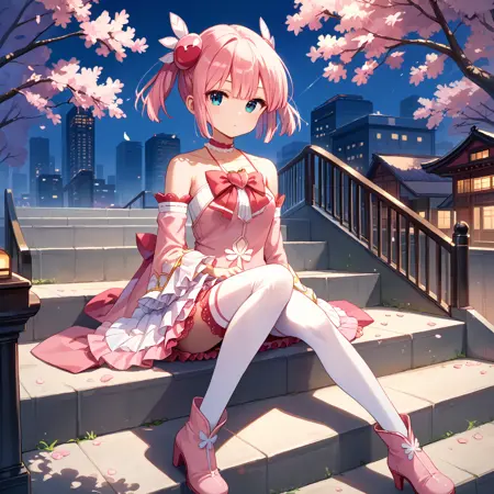 Magical Girl Uniform : chiyoda momo, blue eyes, pink hair, short hair, momo magic, magical girl, short twintails, wing hair ornament, pink bowtie, pink choker, bare shoulders, detached sleeves, pink skirt, layered skirt, pink sleeves, frilled sleeves, frilled skirt, lace-trimmed choker, frilled thighhighs, white thighhighs,