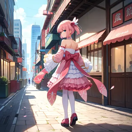 魔法少女制服:千代田桃子,蓝色眼睛,粉色头发,短发,桃子魔法,魔法少女,短双马尾,翅膀发饰,粉色蝴蝶结,粉色项圈,露肩,分体袖子,粉色裙子,层叠裙摆,粉色袖子,荷叶边袖子,荷叶边裙子,蕾丝边项圈,荷叶边过膝袜,白色过膝袜,