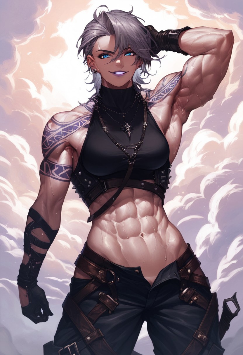 crop top, breasts, pants, jacket, sleeveless, tattoo, arm tattoo, muscular female, navel, midriff, abs, jewelry, ear piercing, necklace, gloves, boots