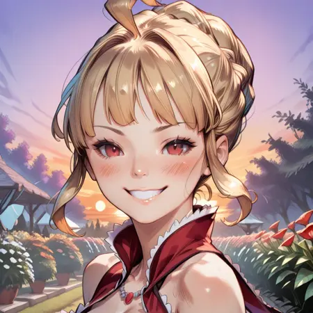 Trigger words: Lea Dragalia, blonde hair, short hair, hair bun, ahoge, red eyes, red dress, cleavage, frilled skirt, gauntlets, white thighhighs, armored boots, high-heeled boots