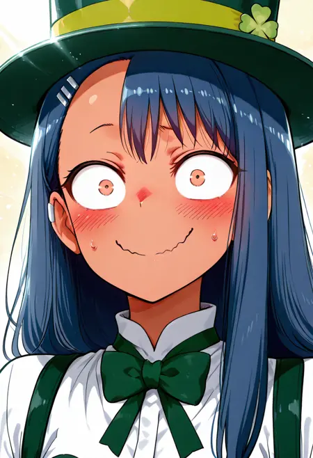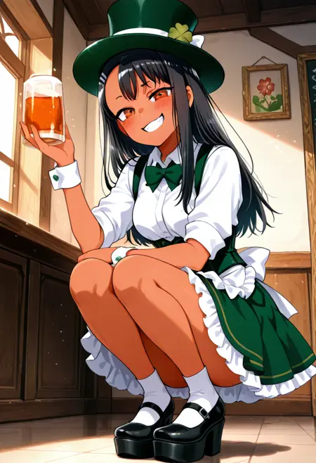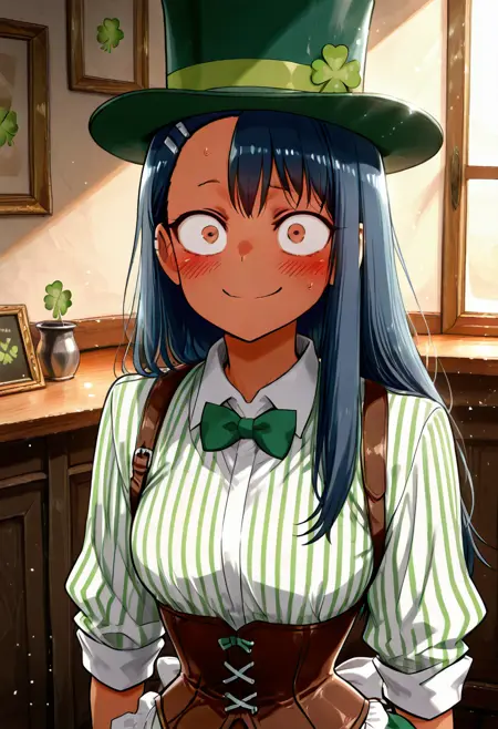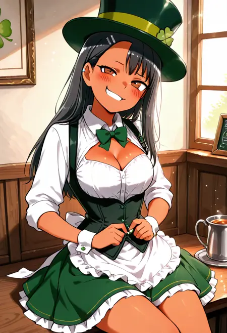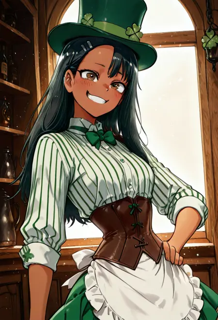 zzNagatoroCitron, brown eyes, black hair, hair ornament, hairclip, long hair, asymmetrical bangs, dark skin, green hat, top hat, striped shirt, waist apron, corset, green shirt, green bowtie, clover, sleeves rolled up,