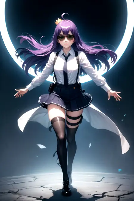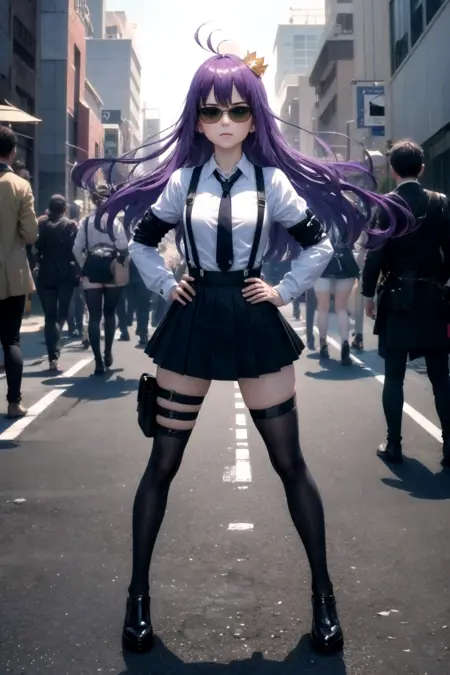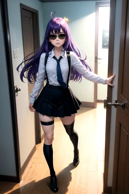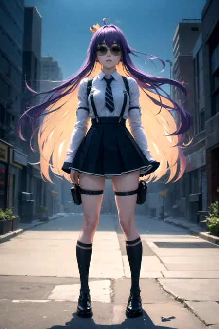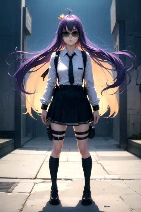 服: サスペンダー、サスペンダースカート、片方のスネストラップ、ホルスター、ハイソックス、シャツ、長そで、ネクタイ