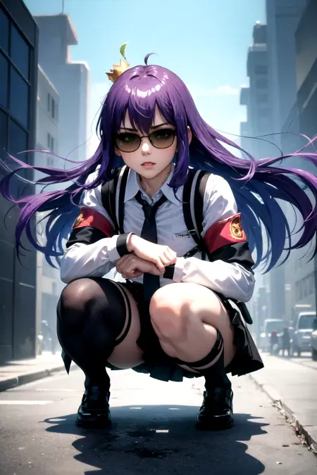 의상: 스타킹 허리띠, 스타킹 스커트, 한쪽 종아리 스트랩, 권총 케이스, 무릎 높이 양말, 셔츠, 긴 소매, 넥타이