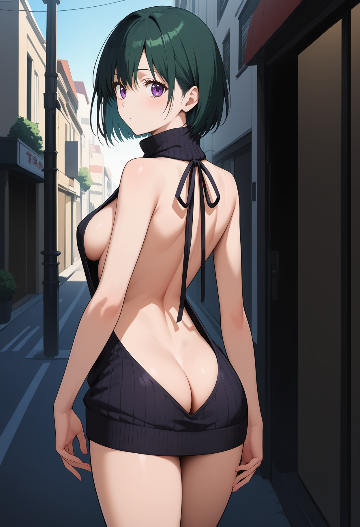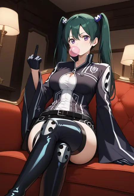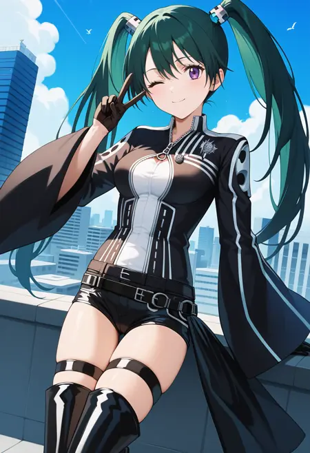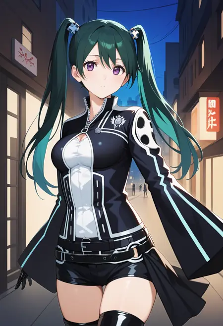 outfit2bblee, long hair, green hair, black hair, twintails, hair ornament, purple eyes, medium breasts, white shirt, black jacket, wide sleeves, long sleeves, black gloves, zipper pull tab, belt, short shorts, black shorts, thigh strap, thigh boots