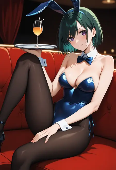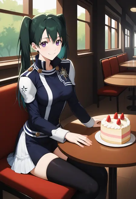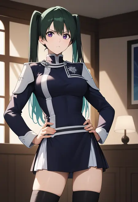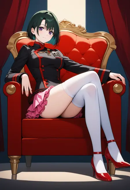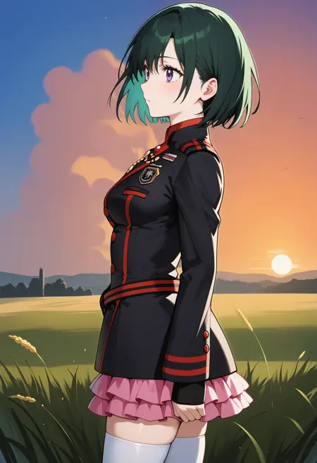 outfit3cclee, short hair, green hair, black hair, purple eyes, medium breasts, aiguillette, military jacket, black jacket, long sleeves, layered skirt, miniskirt, pink skirt, white thighhighs