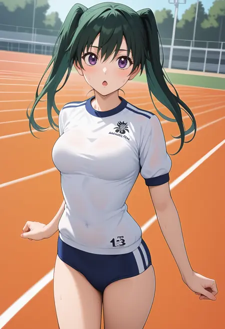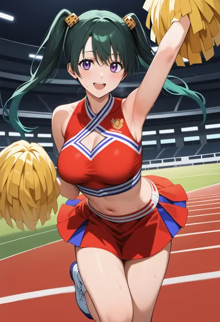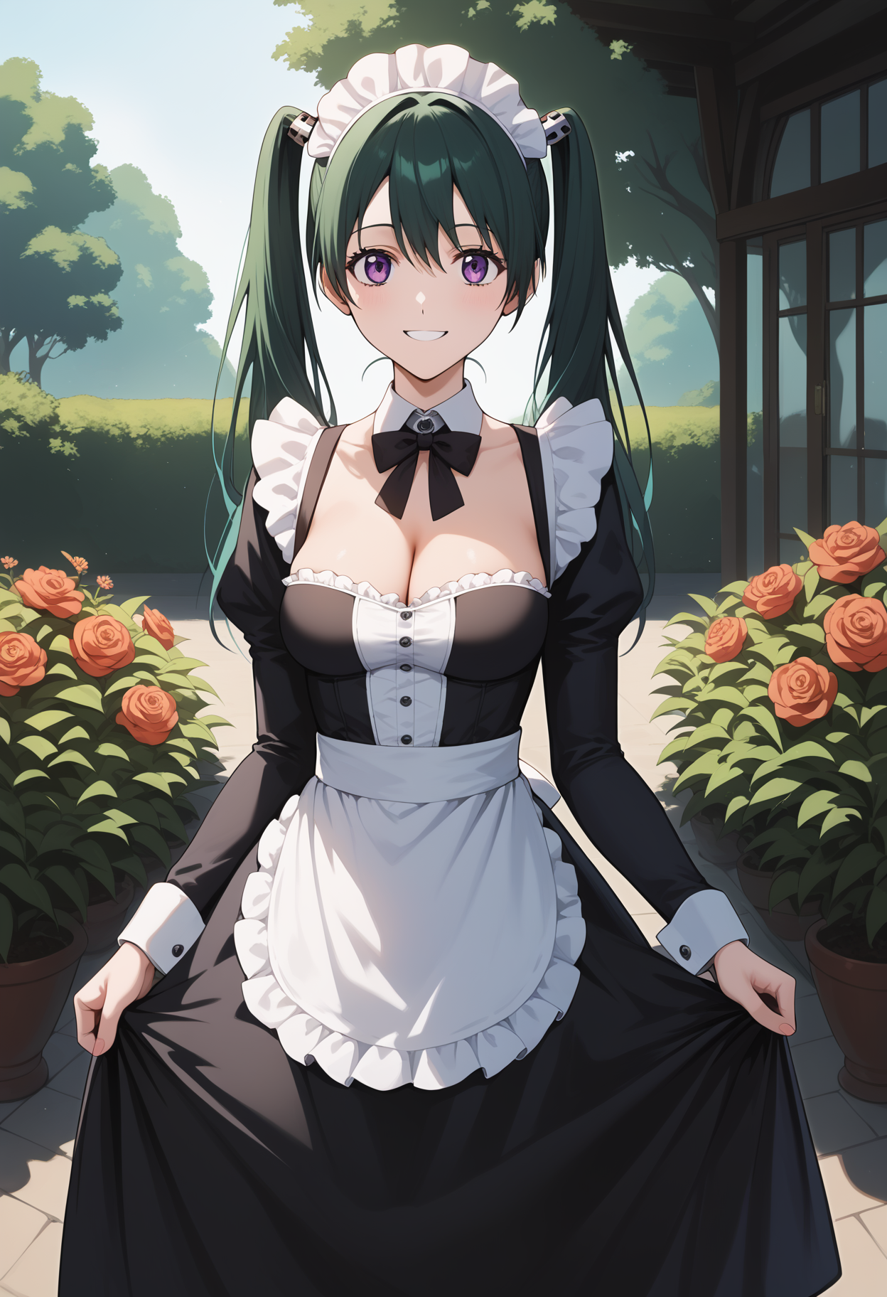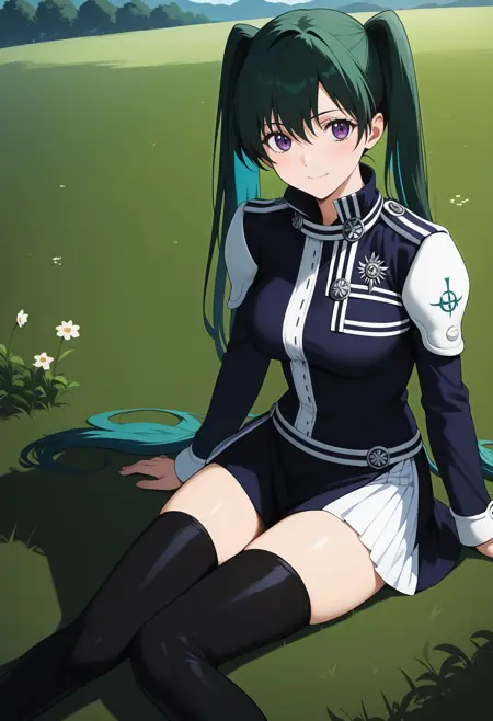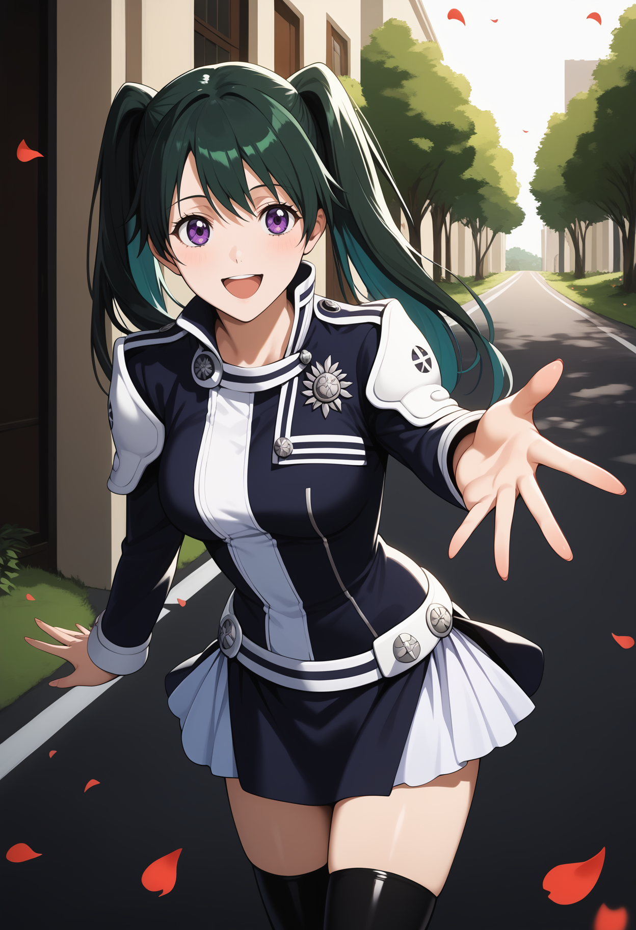 outfit1aalee, long hair, green hair, black hair, twintails, purple eyes, medium breasts, shoulder armor, black jacket, long sleeves, multicolored skirt, black skirt, black thighhighs