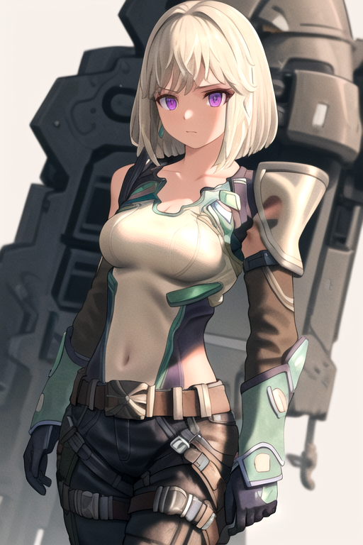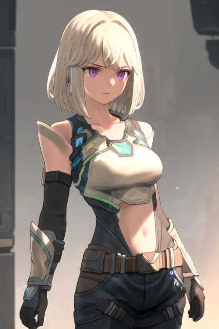 MurderessXenoblade, 1girl, solo, medium hair, blonde hair, black gloves, beige shirt, medium breasts, purple eyes, belt, brown pants, armor