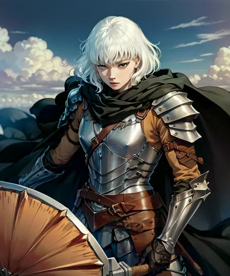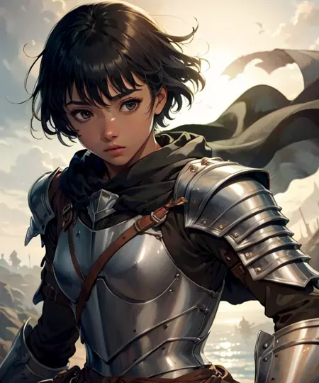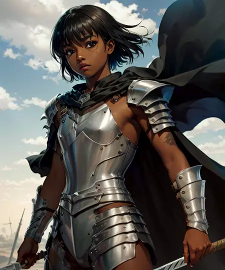 casca : casca \(berserk\), 1girl,armor,, dark skin, flat chest, breastplate, black eyes, bobcut,black cape, saber,knight,very short hair ,skinny, berserk by kentaro miura,