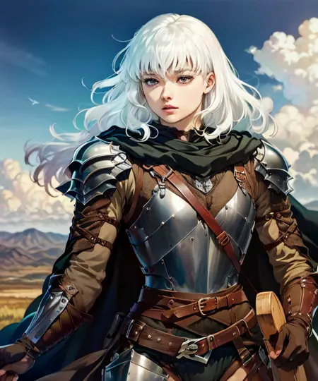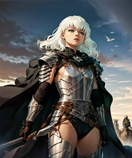 griffith \(berserk\), white hair, ambiguous gender, plate armor, skinny, cape,Milan avant armour,bald eagle, berserk by kentaro miura,