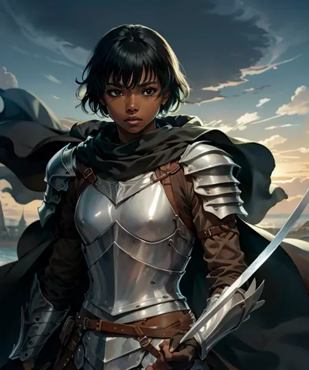 Casca:Casca(《烙印勇士》),1个女孩,盔甲,深色皮肤,胸部平坦,胸甲,黑色眼睛,波波头,黑色斗篷,短剑,骑士,头发极短,瘦弱,《烙印勇士》by Kentaro Miura,