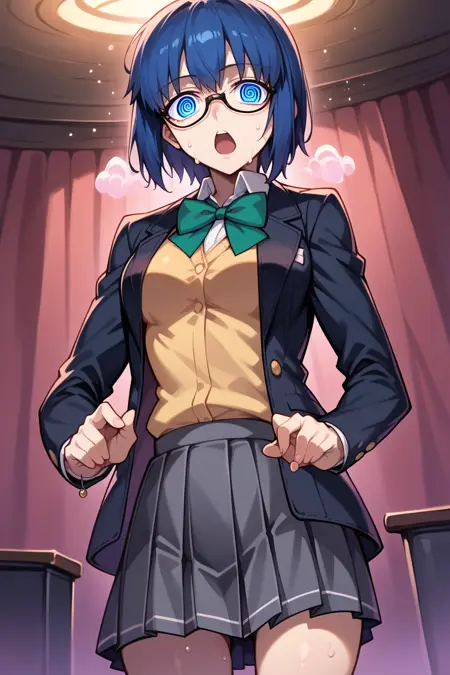 眼鏡、グレーのスカート、リボン、黄色いベスト、ジャケット、制服、緑のリボン、スカート、開いた服、シャツ、ネクタイ、開いたジャケット、白いシャツ、黒縁の眼鏡、緑のネクタイ、プリーツスカート、長袖、襟付きシャツ、黒いジャケット、ベスト、