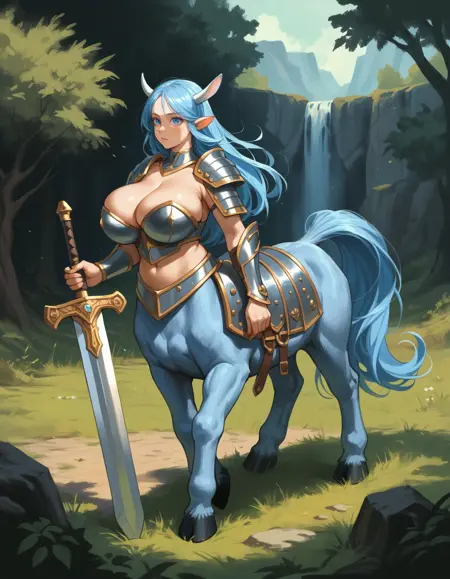 hud_c3ntaur, 单人, 怪物女孩, 巨乳, 全身铠甲, 手持武器, 剑, 半人马形态, 有蹄类, 半人马,
