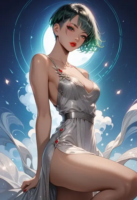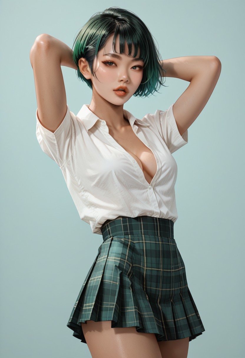 Asian girl, short hair, pixie cut, green hair, blue gradient hair, Asian eyes, dark grey eyes, medium breasts, slim, tanned skin, small round ass, beautiful lips