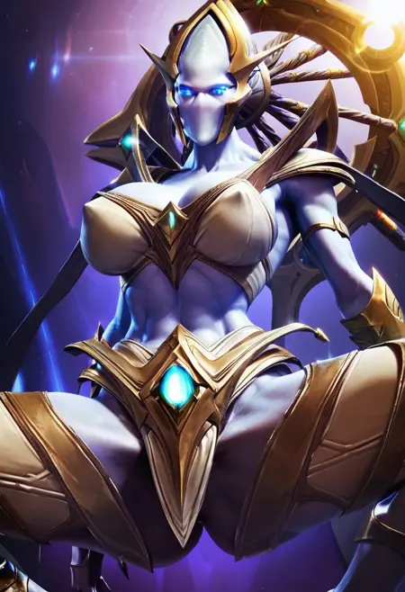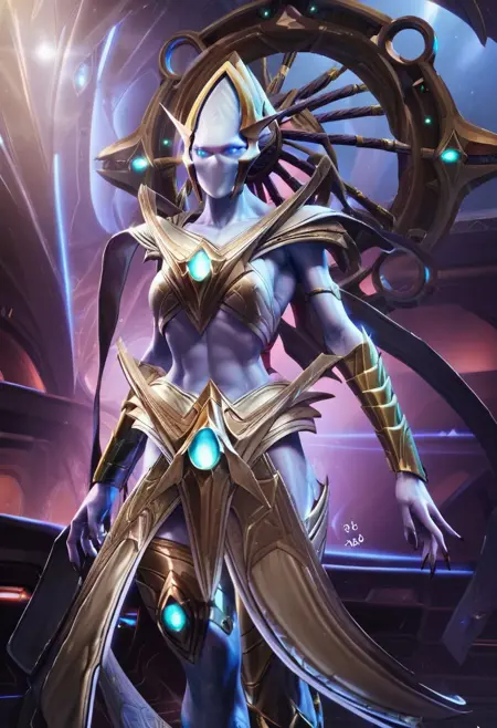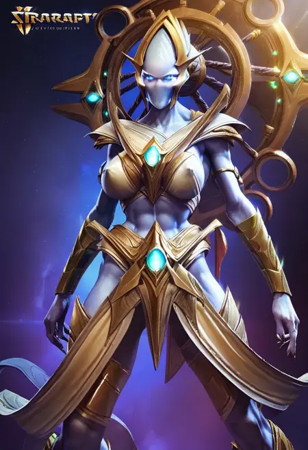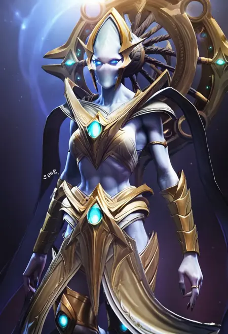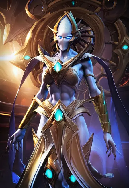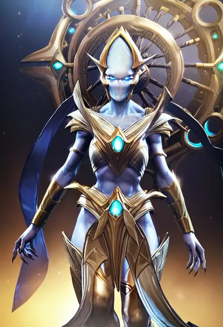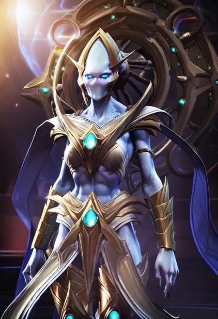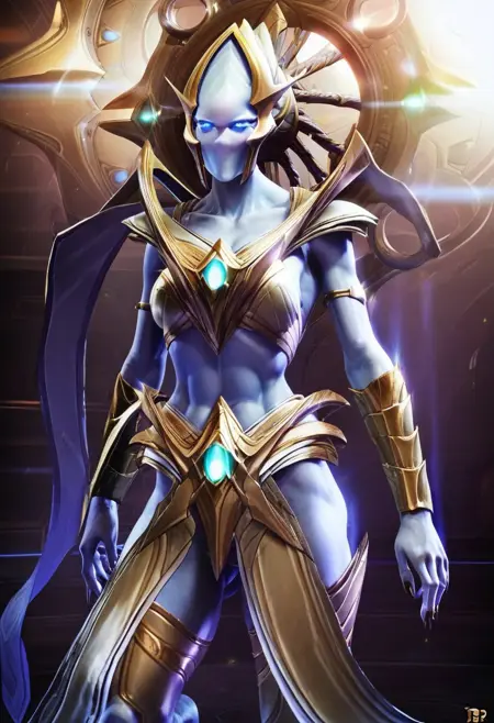 Rohana,1个女孩,单人,星灵女孩,无嘴,无鼻,无耳,细长头部,发光的眼睛,外星女孩,蓝色眼睛,盔甲,彩色皮肤,肩甲,发辫,护臂,金色盔甲,头盔,骨盆帘,胸甲,